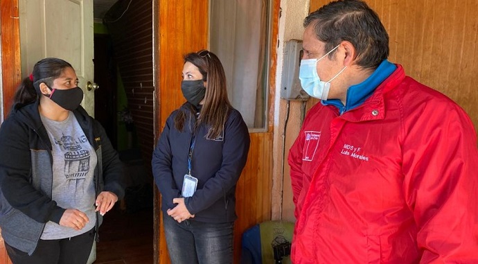 El intendente Patricio Urquieta junto al seremi de Desarrollo Social y Familia, Luis Morales Vergara, y la asesora regional de Hacienda, María Soledad Lingua, calificaron como positivo la distribución de estos beneficios en la región. Asimismo, visitaron a Jessica Cuello y sus 6 hijos, que forman parte del grupo de beneficiarios de la Red de Protección Social, para comentarles sobre este despliegue de apoyo económico y social.