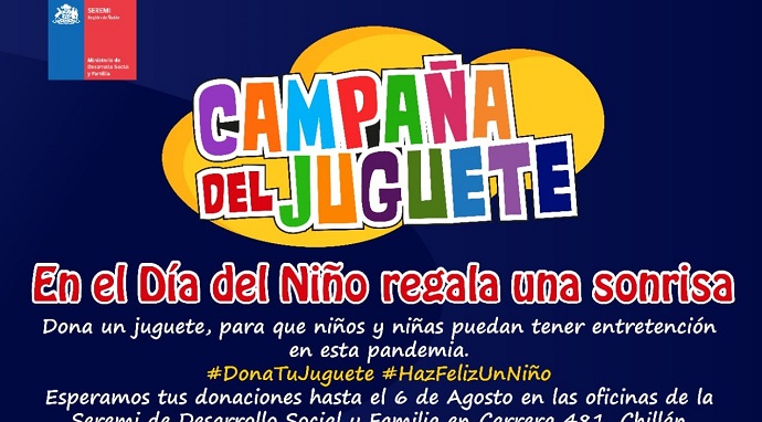 Chillán, Julio 28 de 2020.- Mil juguetes espera reunir este 16 de agosto la campaña “Dona tu juguete, haz feliz un niño”, impulsada por la Seremi de Desarrollo Social y Familia, para ir en apoyo de niñas y niños que reciben alimentación desde los distintos comedores solidarios implementados en Chillán a raíz de la crisis ocasionada por la pandemia.
