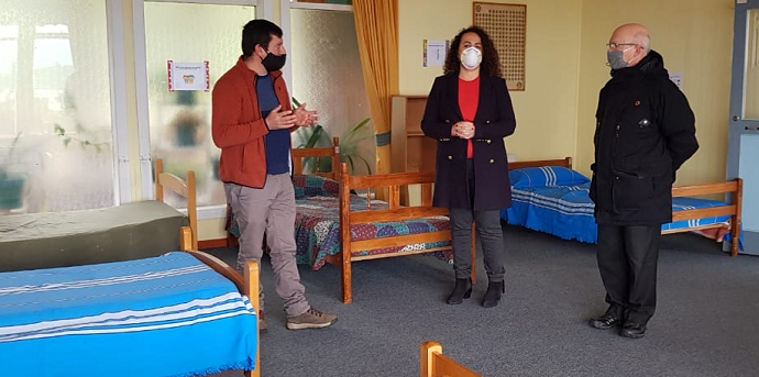 Puerto Montt, viernes 5 de junio de 2020-. En la comuna de Puerto Montt, específicamente en la Casa Nazareth se informó la apertura oficial del albergue de refuerzo que a partir de hoy tendrán las personas en situación de calle. Un espacio adicional ante esta pandemia, 24/7, con todos los resguardos y equipo de profesionales para su cuidado parte del Plan Invierno del Ministerio de Desarrollo Social y Familia, una de tantas acciones que hoy se encuentra liderando la Seremi de la cartera mencionada, Soraya Said Teuber. Dicho albergue viene a reforzar el ya instalado hace unas semanas en la comuna de Puerto Montt, el que también es ejecutado por el Arzobispado. El hito de apertura fue liderado por la Seremi de Desarrollo Social y el Monseñor, Luis Fernando Ramos, quienes realizaron un recorrido de las instalaciones para determinar que cada espacio se encontrara completamente operativo.