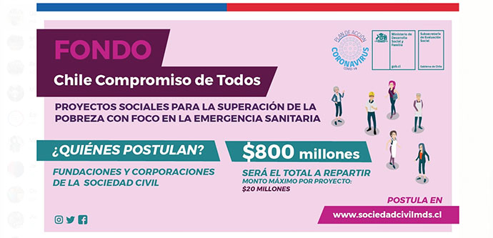 Por lo tanto, se determinó que el fondo Chile Compromiso de Todos en su versión 2020 modificará su calendarización en lo que respecta a su línea de acción relacionada con fundaciones y corporaciones sin fines de lucro, las cuales podrán postular hasta el 14 de mayo de este año. Esta iniciativa busca fomentar proyectos relacionados con esta contingencia y que tengan como objetivo la entrega de bienes y servicios durante este periodo a personas o grupos vulnerables.